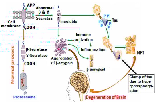 Pathophysiology of AD [15]. Reproduced with permission from Mohd Sajad, Rajesh Kumar, and Sonu Chand Thakur, “History in Perspective: The prime pathological players and role of phytochemicals in AD”; published by ScienceDirect, 2022, licensed by “CC BY 4.0” (https://creativecommons.org/licenses/by/4.0/, accessed on 9 February 2025).