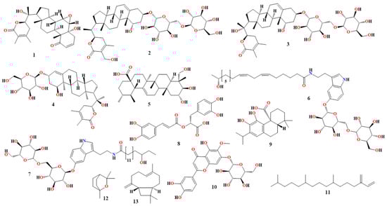 Additionally, ashwagandha protects rats from propoxur exposure. While the aqueous extract of ashwagandha containing derivatives of withanolide, like withaferin A, shows potential protection in differentiated pheochromocytoma PC12 cells infected by hydrogen peroxide and Aβ cytotoxicity, the methanolic chloroform extract of ashwagandha elicits high cell viability and enhances PPAR-c levels [49,50]. The primary phytoconstituents of ashwagandha and their corresponding therapeutic effects for AD are summarized in Table 1 and Figure 2.