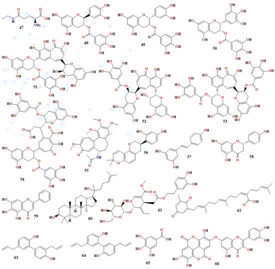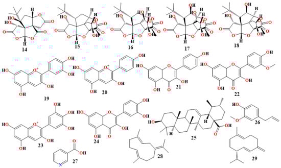 More than thirty real flavonoids, including kaempferol, quercetin, and isorhamnetin conjugated with glucose or rhamnose, are found in Ginkgo biloba. Epiafzelechin, epicatechin, epifisetinidol, epigallocatechin, and epirobinetinidol are the proanthocyanidins. Delphinidin, cyanidin, ginkgolides (A, B, C, and J), bilobalide, and trace amounts of pelargonidin make up the extract’s primary terpenoid component. Table 3 and Figure 3 provide a summary of the phytoconstituents of Ginkgo biloba and their diverse functions in the management of AD [51,67,72,73,74,75,76,77,78].