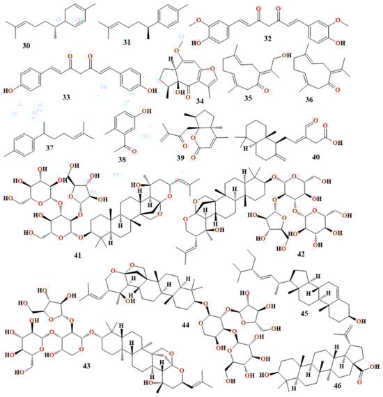 The Zingiberaceae family includes the perennial rhizomatous plant genus Curcuma, also known as turmeric. Numerous plant species in this genus are used in ethnomedicine for their therapeutic qualities [97]. The majority of the medicinal actions of turmeric are attributed to its active components, which are called curcuminoids and comprise curcumin and bisdemethoxycurcumin [98]. Several species of Curcuma, including C. zedoaria, C. angustifolia, and C. leucorrhea, contain the beneficial phytochemical curcumin. According to reports, C. longa has the highest concentration of curcumin [97,98].