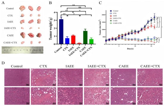 These results indicate that the ethanolic extract of AR has a synergistic effect on the antitumor activity of CTX, which can enhance the chemotherapeutic effect of CTX. In addition, the tumor suppression effect of IAEE and IAEE+CTX combination therapy was more significant than that of CAEE group and CAEE+CTX combination therapy group.
