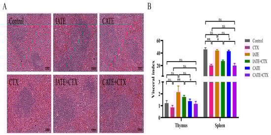 Changes in the weight of the thymus and spleen can reflect whether an immune response has been triggered in the body. Thus, we used this indicator to evaluate the immunostimulatory effects of Astragalus under different cultivation methods. As shown in Figure 2, although cyclophosphamide (CTX) only partially impaired thymic immune function, co-administration with IAEE significantly increased the thymus index. According to changes in the spleen index and H&E staining results (Figure 2A,B), CTX treatment led to a blurred boundary between the red and white pulp in the spleen and a severe reduction in the proportion of white pulp, indicating a decrease in lymphocyte proportion and a substantial impact on spleen immune function. However, administration of IAEE alleviated this phenomenon, as the spleen index increased. IAEE significantly reversed the CTX-induced decline in immune function, with a stronger effect than CAEE.
