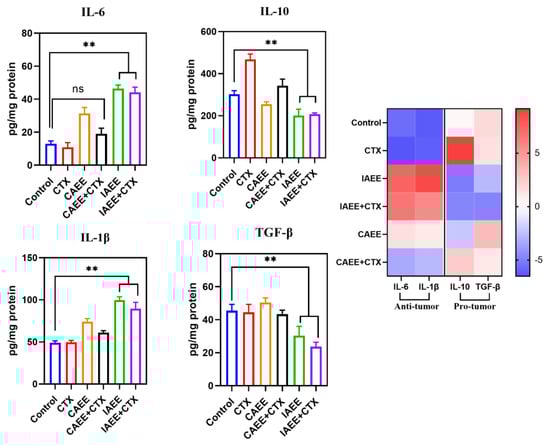 Effects on tumor tissue inflammatory cytokines in mice, ** p < 0.01, ns: no significant difference (n = 6).