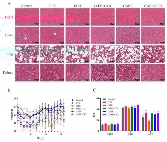 The analytical-grade alcohol was procured from Beijing Chemical Works (Beijing, China). Pure water (18.2 MΩ) was obtained from a Milli-Q System (Millipore, Billerica, MA, USA). Cyclophosphamide (CTX) for injection was purchased from Jiangsu Shengdi Pharmaceutical Co., Ltd. (Nanjing, China), 0.2 g/bottle, national standard H32020857. Fetal bovine serum (FBS) and DMEM-H medium were purchased from Gibco Company of the United States (Waltham, MA, USA). ALT, CRE, and UREA assay kits were obtained from Biosino Bio-Technology and Science Inc. (Beijing, China). Mouse IL-6, IL-10, IL-1β, and TGF-β ELISA kits were purchased from Beyotime (Shanghai, China).