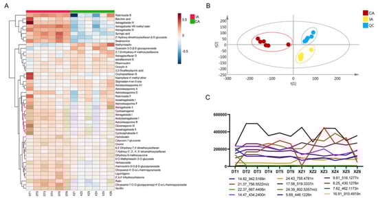 The total ion flow diagrams (TIC) of the imitation wild and cultivated AR (IA and CA) (Figure 6) showed significant differences in their overall composition and some compounds were not identified in IA or CA, such as Syringic acid, 2′-Hydroxy-dimethoxyisoflavan-β-D-glucoside, astragaloside VIII methyl ester, Astroolesaponins F and Astroolesaponins D (Figure 5 and Table 1). To visualize the metabolite differences among samples and further uncover the highly discriminative compounds, PCA analyses were conducted. In order to understand the distribution characteristics of the identified compounds in different sources of AR, we used a heat map as a clearer and more visual way to visualize the data. It is noteworthy that all peaks identified in this study in the heat map were significantly different in different cultivation methods of AR (Figure 7A). In the PCA models for imitation wild AR and cultivated AR, PC1 and PC2 explained variances of 30.2 and 18.8% and 23.4 and 17.9%, respectively. According to the results of the cluster analysis in the positive ion mode, it is clear that the QC sample points are better aggregated, which indicates better stability and precision of the instrument, and under these conditions, there is a certain trend of separation between the two different sources of AR with significant diversity between groups (Figure 7B), which is consistent with the results shown in the TIC plots, where the compounds have more different peaks in different sources of AR (Figure 7A,C), for example, Isoastragaloside II IAEE > CAEE and Rutin IAEE > CAEE.