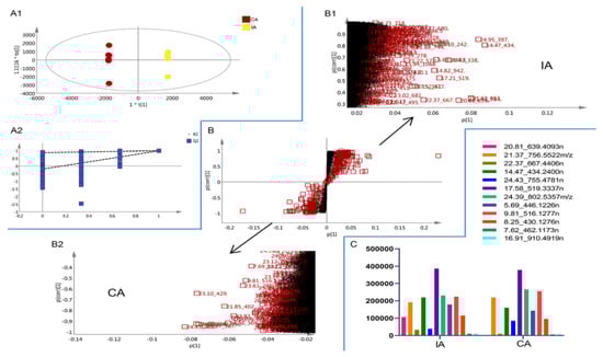An example of marker compound selection in Astragali Radix: (A) orthogonal partial least-squares discriminant analysis (OPLS-DA) score plot (A1) and the reliability of the OPLS-DA model (A2). (B) S-plot score of (B1) IA and (B2) CA. (C) The trend of the relative contents of different compounds in IA and CA.
