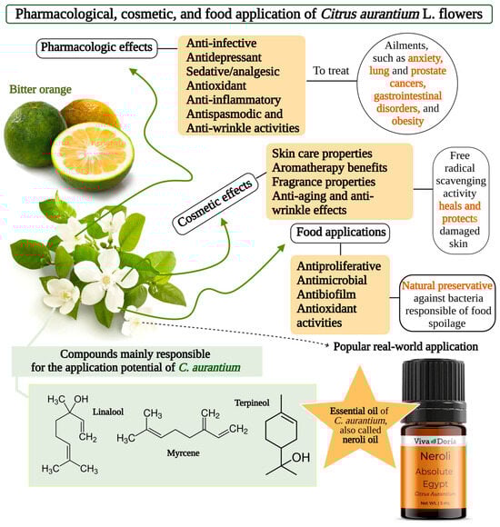 C. aurantium flowers have a widespread application as a flavoring agent in several food products, such as dairy products, or in the pharmaceutical and cosmetic industries as an ingredient in many anti-infective, antidepressant, sedative, and even skin care products, as is shown in Figure 2 [5,9].