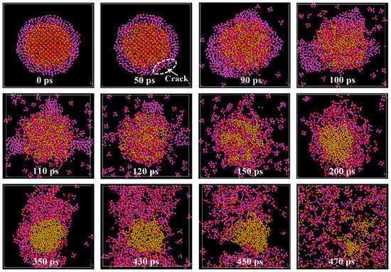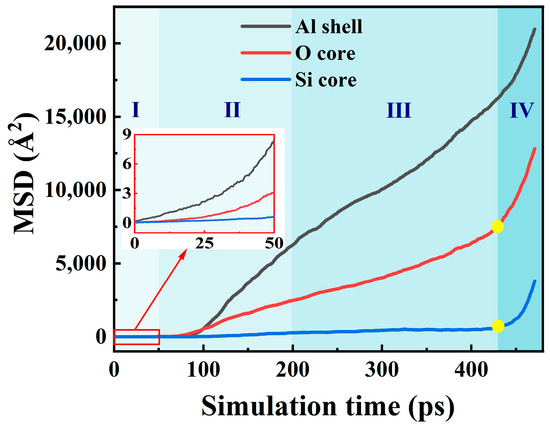 From Table 1, it can be seen that in the first stage (0–50 ps), all atoms show solid-state diffusion behavior. However, in the second stage (50–200 ps), the diffusion coefficient of Si is 3.24 × 10−9 m2/s, indicating that it has liquid diffusion behavior, while the diffusion coefficients of Al and O are 8.00 × 10−8 m2/s and 3.14 × 10−8 m2/s, respectively, indicating that Al and O atoms exhibit partly liquid diffusion behavior and partly gas diffusion behavior. This quantitatively illustrates that at this stage, the intermediate gas products were released from the nanoparticle surfaces observed in Figure 1 and Figure 2. It is noteworthy that Al in the third stage had a lower diffusion coefficient (200–430 ps) than in the second stage because most of the Al5O clusters adhered to agglomerates on the nanoparticles observed in Figure 1. In the last step (430–470 ps), the diffusion coefficients of the Al, O, and Si atoms are all in the 10−7 orders of magnitude, so that a transition from the liquid to the gas phase takes place at this stage.