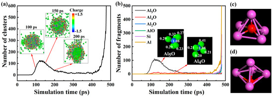 To further analyze the variation in the number of gas clusters observed in the snapshots of Figure 1, the number of gas clusters, intermediate products Al5O and Al4O, and final products Al2O, AlO, Si, and Al are counted at different times and shown in Figure 2. The species of the products is similar to the experimental results (Al2O, AlO, Al) [22] and another theoretical study (metal vapor and Al suboxides) [23] of Al/CuO. As can be seen in Figure 2a, the number of gas clusters increased rapidly after 80 ps, reaching the maximum at around 120 ps, then began to slowly decrease and remained stable. This is consistent with the phenomenon observed in Figure 1. Further analysis of the intermediates in Figure 2b revealed that the change in the number of gas clusters is mainly due to the amount of intermediate Al5O, and the amount of intermediate Al4O is almost constant at this time. This may be due to the interaction of electric field forces between the intermediates and the shell of the nanoparticles. The steric charge distributions at 100 ps, 150 ps, and 200 ps are also shown in Figure 2a. We focus on the charge distribution between two red-dotted circles. According to quantitative calculations, all atoms between two red-dotted circles carry 2.35|e| positive electricity at 100 ps. From the charge distribution of the Al5O and Al4O cluster in Figure 2b, it can be seen that the charge of the Al5O clusters is about 0.32|e|. As shown in Figure 1 and Figure 2b,c, we found that the structure of the Al5O clusters are mainly distorted pentahedron units. We further optimized their structures using the density functional theory (DFT) under the 0 K and ambient pressures and found that the final structures were mostly slightly deformed, as shown in Figure 2d, but these changes, whether in terms of geometric structure or total energy of the cluster itself, are all relatively small, indicating that the Al5O can indeed exist in the form of clusters. Of course, in extreme cases of high temperatures, the anharmonic vibrations between atoms in the cluster will lead to changes in the bond lengths between atoms, and these changes are inconsistent. That is to say, Al-Al bonds with metallic bonding properties will become longer, while Al-O bonds with covalent bonding properties will have relatively shorter changes, and therefore, the distortion of the cluster structure is completely understandable, as shown from Figure 2c,d. Due to the limitation of ReaxFF in treating the energetic material system at high temperatures [24], we can use AIMD to determine the existence and evolution of these clusters at different extreme temperatures, which can be discussed in detail in future work. But the tetrahedron Al4O cluster is nearly charge-neutral, at −0.05|e|, and is consistent with the results by Campbell and co-workers [25]. So, the Al5O clusters and the shell of the nanoparticles repel each other, and more and more Al5O clusters are emitted from the surface of the nanoparticles. At 150 ps, the total charge of the atoms between the two red-dashed circles is −4.84|e|. In the electric field generated by the shell of the nanoparticles, the positively charged Al5O clusters are attracted and then converge to the nanoparticles. This is the reason for the decreasing number of Al5O clusters after 120 ps observed in Figure 1 and Figure 2 after 120 ps. But at 200 ps, the charge between two red-dotted circles is very small, at 0.11|e|. From Figure 2a, it can be seen that the number of clusters stabilizes between 200 ps and 430 ps. After 430 ps, gaseous products rapidly form in large quantities. Figure 2b shows that the products are mainly metal vapor (Al and Si) and metallic metal suboxides (Al2O and AlO), which is consistent with the previous study [21,23].