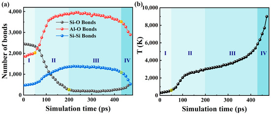 Temporal evolution of (a) number of Si-O, Al-O, and Si-Si bonds, and (b) temperature during the reaction processes of SiO2@Al.