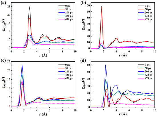 To study the phase state of the system at different times, the partial radial distribution functions g(r) of Al–Al, Si–O, Al–O and Si–Si pairs are calculated and shown in Figure 5. The g(r) gives the local atomic arrangement and is a tool for distinguishing between solid, liquid and gas. The Al–Al atomic pairs in the SiO2@Al core–shell nanoparticles are shown in Figure 5a. At t = 0 ps, the first peak of gAl–Al(r) is sharp and strong, but gAl–Al(r) has few peaks and virtually no long-range order, indicating that the Al shell is an amorphous solid. At t = 50 ps, the Al–Al radial distribution function exhibits the shape typically found for a liquid diffusion peak (with fewer nearest neighbors, and the first peak becomes flat and weak) and no long-range order, indicating the shell has melted and is in the liquid state. After 200 ps, the intensity of the gAl–Al(r) peaks further decreases because of the decomposition of the Al shell, which formed the aluminum oxygen compounds observed in Figure 1. Notably, at t = 470 ps, except the broader and weaker first peak, all of the latter peaks disappear and become similar horizontal straight lines, indicating that most of the Al in the system is already in the gaseous state. According to Figure 5b, the first peak of gSi–O(r) occurred at r = 1.7 Å at 0 ps and 50 ps, and its sharp shape indicated strong interactions between Si and O atoms. As the reaction of aluminum and cristobalite progresses, the intensity of the first peak gSi–O(r) weakens (t = 200, 430 ps), and other peaks disappear, showing that the Si–O bonds are completely broken with no interaction, which is similar to the nanostructured evolution shown in Figure 1 and temporal evolution of number of Si–O bonds in Figure 3a. As can be seen in Figure 5c, the first peak intensity of gAl–O(r) increased significantly to the maximum at 200 ps as the Al atoms reacted with the O atoms of SiO2 in the course of the reaction, which is consistent with the conclusion obtained in Figure 1 and Figure 3a that the system undergoes a redox reaction that generates aluminum oxide. After 200 ps, the first peak intensity of gAl–O(r) began to decline, indicating that the interactions between Al and O atoms become weak. At t = 470 ps, the first peak of gAl–O(r) still retains its sharp shape, and the second peak of gAl–O(r) disappears, further illustrating that most of the final gas products found in Figure 2b are mainly aluminum metallic suboxides (Al2O and AlO). From Figure 5d, gSi–Si(r) has multiple peaks and practically long-range order at t = 0 ps and 50 ps, indicating that SiO2 core is a crystal. At t = 200 ps, the first peak of gSi–Si(r) is sharp and strong, but gSi–Si(r) has few peaks, confirming the pure liquid Si observed in Figure 1. At t = 470 ps, the curve of gSi–Si(r) is similar to the curve of gAl–O(r), which is another indication that most metallic Si products are already in the gaseous state.