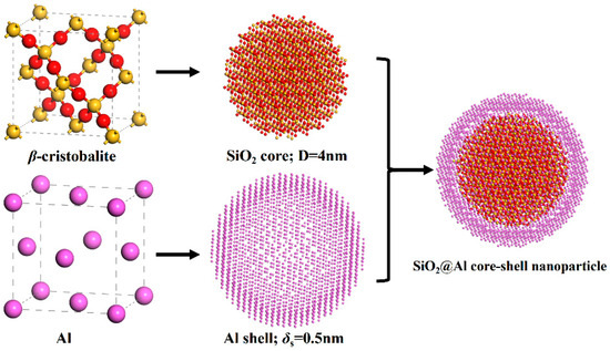 The original configuration of the core–shell SiO2@Al nanoparticle consisted of a nanocrystalline β-cristobalite (SiO2) core with a diameter of 4 nm containing 2193 atoms and a nanosized face-centered cubic (fcc) crystalline aluminum shell with 0.5 nm 2204 atoms. The spatial distances between the SiO2 core and the Al shell were chosen to be approximately 0.2 nm, so that the total diameter of the core–shell SiO2@Al nanoparticle is 5.4 nm, with a total of 4397 atoms (2204 Al + 729 Si + 1464 O). The SiO2@Al nanoparticle was placed in the center of a cubic box with sides of 6.88 nm to model the reaction process in a relatively free space. The details of the models are shown in Figure 6. It is important to note that there is always a naturally generated aluminum oxide layer of approximately 2 nm on the Al at room temperature [34]. However, the purpose of this work is to increase the high reactivity of the pure Al surface and improve the reaction rate of SiO2@Al. To avoid the interference of Al oxides, the active Al content in the SiO2@Al models used in this study is up to 100%.