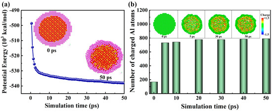 In this study, all MD simulations used the periodic boundary condition and a time step of 1 fs. The initial configuration of the SiO2@Al nanoparticle was first minimized in energy using the conjugate gradient (CG) algorithm. The second stage was subjected to a relaxation phase to eliminate the residual stress in the nanoparticle so that the energy of the nanoparticle reaches its lowest state. The SiO2@Al nanoparticle was relaxed at 300 K for 50 ps in the NVT ensemble. The temporal variation of potential energy during relaxation is shown in Figure 7a. The relative error of potential energy at t = 30~50 ps is 0.29%, which is below the criterion of structural stability (the fluctuation of potential energy within 20 ps is less than 1.2%) [35]. After 50 ps, the system reached a stable state. The yz cross-sectional view of the relaxed configuration is also shown in Figure 7a. Compared to the pre-relaxation configuration, the relaxed Al shell has more irregular atom arrangements and the coupling between the Al shell and the SiO2 core is tighter, resulting in a more stable structure. Therefore, the duration of the relaxation phase corresponds to the requirements. Figure 7b shows the number of charged Al atoms and charge distribution of the Al shell in the SiO2@Al nanoparticle at different times during the initial relaxation phase. It can be observed that the oxide film has already formed at the inner interface of the Al shell after 10 ps, which is due to the reactivity between pure Al and SiO2, leading to redox reactions and charge transfer. This also explains the significant decrease in potential energy. The third stage was carried out in the microcanonical (NVE) ensemble to simulate the adiabatic thermite reaction up to thermal decomposition. The reaction simulations lasted 470 ps.