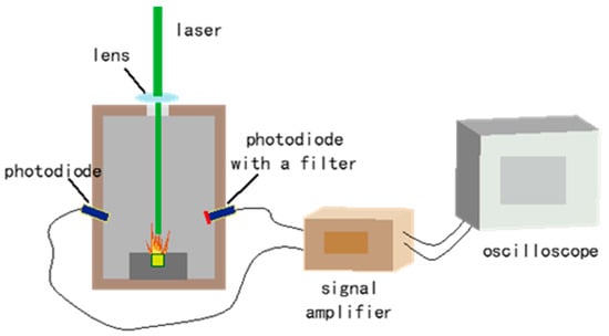 The experimental setup used for laser ignition is depicted in Figure 1. The sample holder was a cylindrical stainless steel chamber with a Φ3 × 3 hole. About 10 mb of each sample was lightly pressed into the hole (filling density about 0.8 g·cm−3). The initiation source was a diode laser(Hamamatsu S1149; Hamamatsu Photonics K.K., Shizuoka, Japan) of 1.4 W with a wavelength of 450 nm in continuous wave mode. The size of the laser spot was adjusted using a lens with a 50 mm diameter and a 50 mm focal length. When the laser acted on the sample’s surface, the sample began to react, generating a flame. At the same time, the light signals of both the laser and the flame were collected using a photodiode and recorded with a digital oscilloscope (Agilent Technologies DSO7034B, Agilent Technologies, Inc., Beijing, China). Moreover, the photodiode with a filter merely detected the flame signal due to it filtering out the laser. The time difference between the two signals was measured as the ignition delay time. Each experiment was conducted in a dark environment, and the results were taken as the average from ten tests at each laser power.