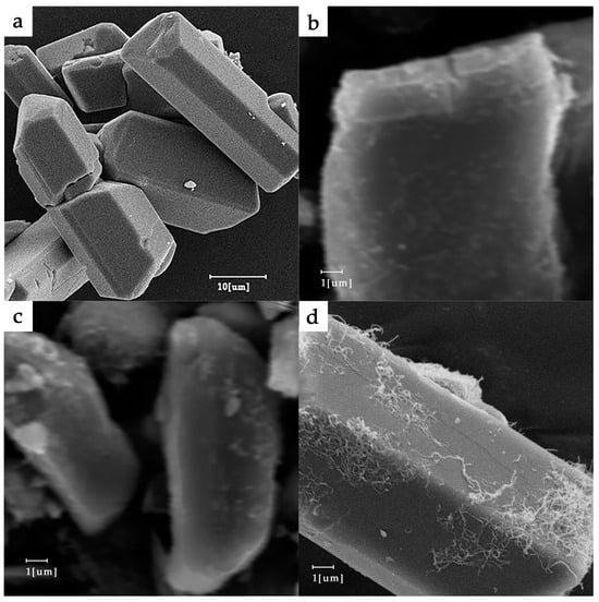 The crystal morphology of KP was characterized by scanning electron microscopy (SEM; EM-30PLUS; Beijing Tianyao Technology Co., Ltd., Beijing, China) operated at 20 kV. The physical structures of KP on the MWNT walls were observed with a transmission electron microscope (TEM; JEOL 2100F; JEOL (BEIJING) Co., Ltd., Beijing, China) operated at 200 kV. The KP crystal that covered the MWNT surface was washed until clean with hot water before the TEM test. The thermal properties of the KP/MWNT composites were analyzed using thermal gravimetric and differential thermal analysis (TG-DTA; HCT-1; Beijing Hengjiu Laboratory Equipment Co., Ltd., Beijing, China) with a heating rate of 10 °C·min−1 at temperatures ranging from 50 to 400 °C under N2 flow. The X-ray diffraction (XRD; Rigaku SmartLab SE, Tokyo, Japan) measurements were conducted at a scanning rate of 2°/min. Fourier-transform infrared (FTIR; Spectrum 100 Optica FT-IR Spectrometer; PerkinElmer, Shelton, CT, USA) spectroscopy was performed within a scanning range of 4000–600 cm−1 and a resolution of 1 cm−1.