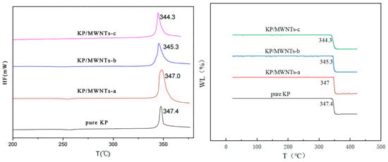 The thermal properties of samples with different MWNT contents were tested using TG-DTA under a N2 flow. Figure 5 shows that the decomposition peak slightly advanced as the MWNT content increased. The pure KP exothermal peak was at 347.4 °C, and those of KP/MWNTs-a, KP/MWNTs-b, and KP/MWNTs-c were at 348.0, 345.3, and 344.3 °C, respectively. The MWNTs accelerated the KP thermal decomposition reaction because of their strong thermal conductivity. However, a small amount of individual MWNTs had only a minor effect on the thermal properties of KP, as the sample’s exothermal peak only slightly advanced (by less than 5 °C).