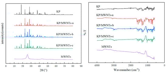 XRD and FTIR results for KP, MWNTs, and KP/MWNTs.