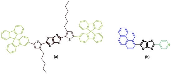 In the last few decades, small organic molecular dyes have attracted great interest due to their wide applications in optoelectronic devices such as organic light emitting diiodes (OLEDs) or photovoltaics [1,2,3,4]. Among these small organic molecular dyes, thiazolo[5,4-d]thiazoles (TzTzs) which are formed by two fused coplanar thiazole rings are particularly interesting [5]. This rigid backbone presents an extended π-conjugated system with a high oxidative stability thanks to the electron-deficient nature of the sp2 nitrogen [6]. Moreover, tuning of their electronic properties can be achieved by modifying their symmetry. Indeed, TzTzs can be qualified as symmetric with identical moieties on both sides or asymmetric when bearing different ones. As an example, symmetric TzTzs with a spirobifluorene moiety have been described in 2023 for their applications in electroluminescent devices [7] (Figure 1a), whereas an asymmetric TzTz incorporating a pyrene (donor) and a pyridine (acceptor) (Figure 1b) was used as a push–pull system with promising applications in bio-imaging [8].