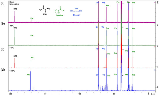 13C{1H} NMR study of DTO stability in the Pro:Gly (1:2) DES at different temperatures: (a) room temperature, (b) 45 °C, (c) 75 °C and (d) 110 °C. * corresponds to DMSO signal.