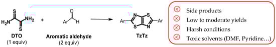 Even if there is a great interest in TzTz-based materials, the synthesis of those compounds still generally relies on the well-known Ketcham method [9], while exploring other conditions is only marginally done. Actually, the synthesis of TzTzs seems quite easy as they can be obtained in a single step with a double condensation reaction between dithiooxamide (DTO) and an aromatic aldehyde (Scheme 1). However, one serious drawback is their laborious isolation and purification as the reaction often leads to resinification and formation of side products, giving low to moderate yields of TzTzs [6]. Moreover, TzTzs are generally poorly soluble and are sometimes difficult to characterize [10].
