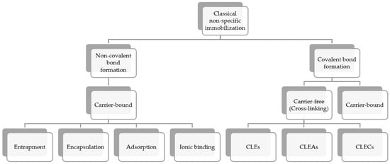 Carrier-bound and carrier-free immobilization methods. Abbreviations: CLEs–cross-linked enzymes; CLECs—cross-linked enzyme crystals; CLEAs—cross-linked enzyme aggregates.