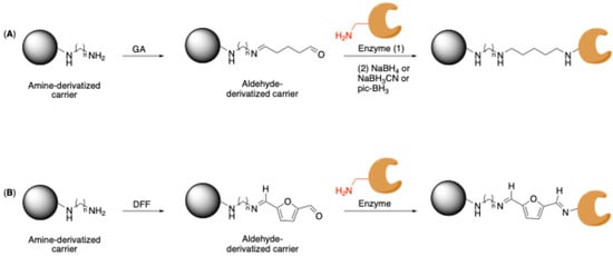 The amino groups on the functionalized carrier can react with the enzyme after pre-activation with glutaraldehyde (GA) [46] or other safer bifunctional reagents (e.g., 2,5-diformylfuran [47]) (Scheme 2). This process involves the interaction of the resulting aldehyde groups with the enzyme’s amino groups, generally at basic pH values (pH 10), leading to the rapid formation of Schiff bases, which are unstable under acidic conditions. These imines can subsequently be reduced (e.g., usually by NaBH4, NaBH3CN, or 2-picoline borane complex), resulting in irreversible enzyme immobilization, although this may carry the risk of diminishing the activity of the biocatalyst [16,18,45,48]. If 2,5-diformylfuran (DFF) is used, the imine bond is also stable at acidic pH values thanks to the conjugation of the formed imine bond with the furan ring, thus avoiding the reduction step [47].