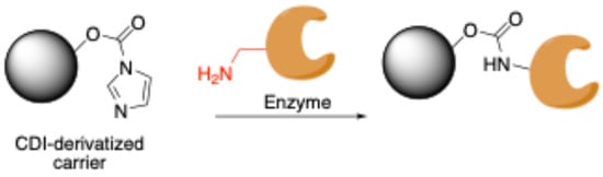 Different immobilization binding chemistry can be used when N,N′-carbonyldiimidazole (CDI) is employed to activate the agarose. CDI is a highly reactive carboxylating agent that contains two acylimidazole leaving groups, which form reactive carbonyl groups on the hydroxyl support. This conjugate reagent has been successfully used in peptide synthesis and also in the immobilization of enzyme and affinity ligands in a chromatography matrix. The activation process of the carrier has to be performed in anhydrous media due to the susceptibility to hydrolysis of CDI [50]. Immobilization on agarose-CDI is another technique that enables multipoint enzyme-support interaction through the formation of carbamate bonds between the surface lysins of the enzyme and the activated support (Scheme 6). Few examples of enzyme immobilization via CDI-carrier are currently reported in the literature [64]. A very interesting example involves the conjugation of ovalbumin, used as a model antigen, onto magnetite nanoparticles for application as particulate vaccines [50].