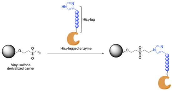 Covalent site-specific immobilization of His-tagged proteins onto vinyl sulfone-bearing surface. The imidazole group of the last His residue of His6-tag is deprotonated at neutral pH and can undergo Michael-type addition by vinyl sulfone groups present onto the carrier.