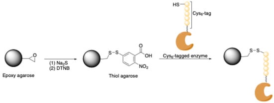 Covalent site-specific immobilization of Cys-tagged proteins onto thiol agarose. The commercially available epoxy agarose was derivatized with the thiol group in two steps: overnight incubation with 50 mM Na2S in 100 mM NaHCO3 pH 10 and subsequently incubation of 3 h with 10 mM 2,2′-dinitro-5,5′-thiobenzoic acid (DTNB). The Cys-tagged enzyme was covalently bound to the carrier by thiol exchange.