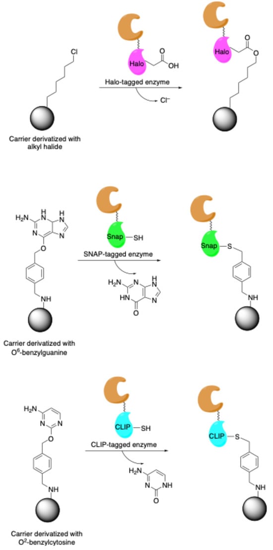 Site-specific covalent enzyme immobilization by fusion to self-labeling tags: HaloTag (33 kDa) forms a covalent bond through nucleophilic displacement of halides from alkyl halide derivatized carriers, SNAP-tag (20 kDa) reacts with O6-benzylguanine derivatized carriers while CLIP-tag (also 20 kDa) reacts with O2-benzylcytosine derivatized carriers.