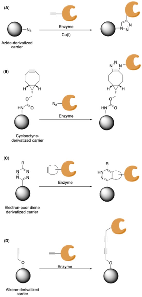 The site-specific covalent immobilization procedures rely on the introduction of a unique bio-orthogonal chemical group or a sequence tag in the enzyme at a site-specific location that is able to form a covalent bond with a mutually reactive group present on a carrier. The site of enzyme engineering has to be strategically chosen in order to not impact the conformation of the enzyme and, thus, its catalytic activity. Three different strategies can be applied to achieve site-specific covalent immobilization as depicted in Figure 2: (i) tag-mediated immobilization, (ii) immobilization via naturally occurring amino acids positioned in specific regions of the protein, and (iii) immobilization via unnatural amino acids.