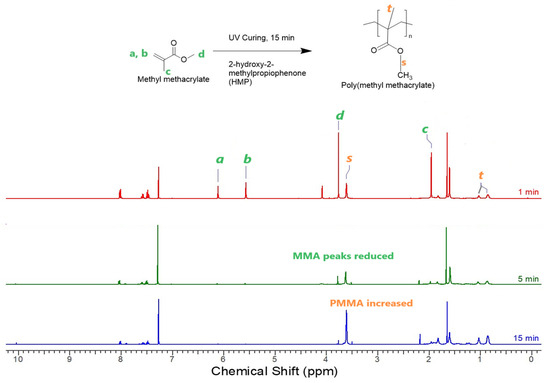 1H NMR spectra of PMMA coatings with 1, 5, and 15 min UV curing.