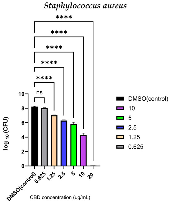 Minimum bactericidal concentration for CBD was also determined by preparing solutions in DMSO similar to the procedure described in Section 3.5. Prepared CBD samples with concentrations ranging from 20, 10, 5, 2.5, to 1 mg/mL were tested against pathogenic S. aureus (ATCC® 29213™), E. coli (ATCC® 25922™), and S. agalactiae (ATCC® 10231™), which were added to each sample at an initial OD600 0.01. The samples underwent incubation at 37 °C for 24 h. After incubation, the samples were plated and their respective colonies were counted and recorded. The MBC was defined as the lowest concentration of CBD that eradicated 99.9% of the original inoculum with no colony forming unit being observed when plated. The experiment was replicated in three distinct trials, and the outcomes were graphed using GraphPad Prism (San Diego, CA, USA).