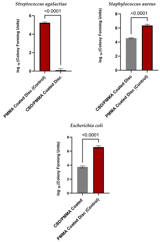 Log (CFU) counts of bacteria in MMA coatings and PMMA/CBD coatings after 24 h incubation with S. agalactiae, S. aureus, and E. coli biofilms. p-value of 0.001 resembles a high significant difference between the two groups.