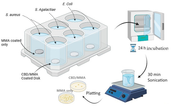 Biofilm formation on the surface of the coated discs (both PMMA/CBD-coated and PMMA-coated control discs) was obtained in 6-well plates, fitting one disc for each well. Then, 20 µL of bacterial suspension, 10 µL of a 40% (v/v) glucose solution, and 2 mL broth media were added to each well, thus guaranteeing submersion of the disc into the medium with bacteria. Plates were then immediately incubated at 37 °C for 24 h under static conditions. Two independent replicate experiments were conducted. Figure 6 shows the workflow for the biofilm studies.