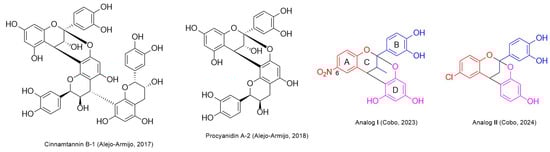 - Cobo, A.; Alejo-Armijo, A.; Cruz, D.; Altarejos, J.; Salido, S.; Ortega-Morente, E. Synthesis of analogs to A-type proanthocyanidin natural products with enhanced antimicrobial properties against foodborne microorganisms. Molecules 2023, 28, 4844. [Google Scholar] [CrossRef]