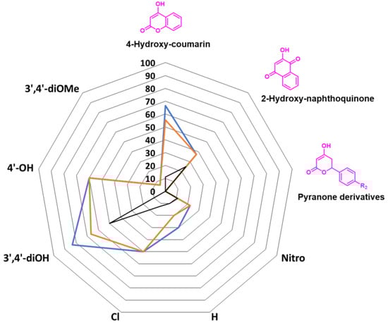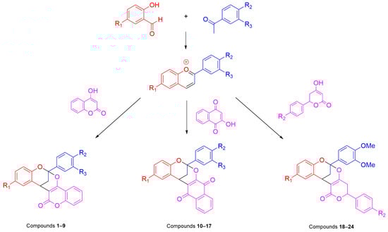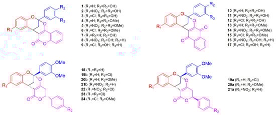 Compounds 1–24 (Table S1, Supplementary Materials) displayed in Figure 2 were obtained by reaction of flavylium salts with three different π-nucleophiles, such as 4-hydroxy-coumarin, 2-hydroxy-naphthoquinone and several pyranone derivatives (Scheme 1) [16]. Flavylium salts were synthesized by aldol condensation under acidic conditions between salicylic aldehyde and acetophenone derivatives according to procedures previously used by us [17].