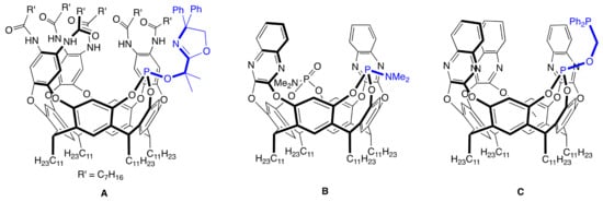 Cavitands can be easily functionalized [5,6], and a large variety of coordinating functions can be introduced, in particular phosphorus or nitrogen derivatives and N-heterocyclic carbenes [7,8]. This preorganization platform has led to sophisticated catalysts [9,10,11,12,13] as demonstrated by Gibson and Rebek with their expanded cavitand A, which is able to form P,N-chelate (Figure 1) [14]. In the palladium-catalyzed allylic alkylation with dimethylmalonate, the partial entrapment of the substrate in the pocket formed by the cavitand favors nucleophilic attack on the less sterically carbon atom, exclusively leading to the formation of the linear products. Iwasawa and co-workers observed that in the gold-catalyzed hydration of 1-butynylbenzene with the cavitand B, which has phosphoramidite and phosphoramidate moieties, 98% of 1-phenyl-2-butanone was formed, with only 2% of 1-phenyl-1-butanone (Figure 1) [15]. Notably, in the test with cavitand devoid of phosphoramidate substituent, no conversion of the alkyne was observed. The authors confidently interpreted these results as an activation of the water molecule by the ideally positioned P=O group, which facilitates its addition to the alkyl bond. Chaplin and co-workers recently reported a tris-quinoxaline extended resorcin[4]arene on which a bis-phosphinated substituent (phosphite-phosphine) was grafted (C; Figure 1) for the rhodium-catalyzed hydroformylation of terminal alkenes [16]. The hydroformylation of octene under 20 bar of syngas at 60 °C with the [Rh(acac)C] (acac = acetylacetonate) complex resulted in a 5.9 times higher proportion of branched aldehyde than linear. The unusual regioselectivity was explained by the authors by the steric constraints imposed by the quinoxaline walls on the catalytic center. These constraints, during the insertion step of the olefin in the Rh-H bond, result in the formation of secondary alkyl intermediate, rather than the linear one.