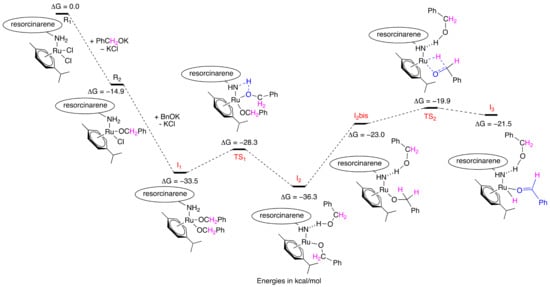 The catalytic tests demonstrate that the relative position of the two metal centers on the resorcin[4]arene platform directly affects the rate of the catalytic reaction, as illustrated by the superior performance of complex 2, where the two ruthenium atoms are attached to two proximal aromatic rings. DFT calculations on the N-alkylation of aniline with benzyl alcohol were carried out using complex 3 as the pre-catalyst. This catalytic reaction can be divided into three steps: (i) the activation of the pre-catalyst and the oxidation of benzyl alcohol into benzaldehyde, (ii) the formation of N-benzylideneaniline from benzaldehyde and aniline, and (iii) the reduction of the imine into N-benzylaniline [30]. As is typically observed with amine or carbonyl function ligands, an outer-sphere pathway is a viable option [26,31].