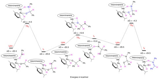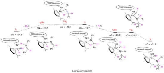 After the benzyl alcohol/aniline ligand exchange (intermediate I3bis), the C-N bond was formed between the amine and the benzaldehyde. This new bond was formed via the 6-membered ring transition state TS3 with a high barrier of ΔG = −4.5 kcal/mol. A proton from the aniline was transferred to the amine of the cavitand. The resulting intermediate I4 (ΔG = −25.6 kcal/mol) was rearranged into I4bis (ΔG = −20.3 kcal/mol) before the generation of the phenyl(phenylamino)methanol. This step occurred via TS4 (ΔG = −12.6 kcal/mol) and the transfer of a hydrogen atom of the amine to the alcoholate. The formed aminoalcohol was maintained in the coordination sphere of the ruthenium through interactions between the primary amine of cavitand and the hydrogen of the secondary amine of the product (intermediates I5 and I5bis; ΔG = −15.9 and −20.5 kcal/mol, respectively). The final step was the dehydration of the aminoalcohol, which required the high-energy transition state TS7 (ΔG = −4.3 kcal/mol), in which a hydrogen atom and the hydroxyl moiety were transferred to the amines of the cavitand and the ruthenium atom, respectively. The resulting imine remained in the coordination sphere of the metal through interaction between the macrocyclic amine and the nitrogen atom of the imine (I6, ΔG = −24.5 kcal/mol) (Figure 5).