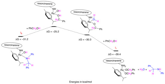 Finally, starting from the intermediate I8, it is possible to regenerate the active species I1 via a series of ligand exchanges and the transfer of one proton from the benzyl alcohol to the amine of the macrocycle (Figure 7). This sequence is exothermic with the final structure, which comprises the formation of water molecule and the release amine at −39.4 kcal/mol (slightly more stable than I1 in Figure 4). It should be noted that in the fullly computed mechanism, the ruthenium cation remains at the oxidative state of +II.