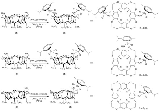 In the second step, the dimeric [RuCl2(p-cymene)]2 precursor reacts with anilines to form the corresponding [RuCl2(p-cymene)(H2NAr)] complexes, in which the ruthenium is coordinated to the nitrogen atom [24,25,26,27]. The ruthenium complexes 1–3 were obtained at a 68–72% yield by the reaction of the amino-cavitand and the [RuCl2(p-cymene)]2 precursor (Scheme 2). They were fully characterized using elemental analysis, NMR, and mass spectroscopy. The symmetry of the complexes is identical to that of the corresponding free ligands 4–6. Complex 3, with a single metal center, unquestionably displays two AB systems at 5.58/4.38 and 5.58/4.31 ppm for the four OCH2O groups. The 1H NMR spectra of the bis-metal complexes 1 and 2 are less well resolved than that of complex 3, which suggests that the presence of two “RuCl2(p-cymene)” moieties severely restrict free rotation. The mass spectra analysis of the three complexes confirmed the formation of the targeted complexes. Each organometallic compound has a peak, m/z = 1423.42 for 1 and 2 and 1102.45 for 3, corresponding to [M − Cl]+ cations with the expected isotopic profiles.