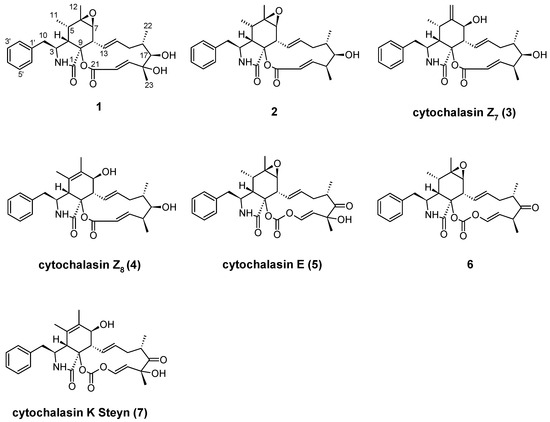 Chemical structures of cytochalasins 1–7 isolated from Nemania diffusa DSM 116299.