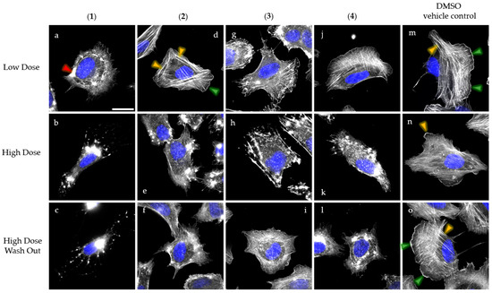 In the case of 1, the actin cytoskeleton of U-2OS cells was strongly affected, starting with the depletion of F-actin-containing structures, such as lamellipodia—protrusive actin meshwork at the cell periphery (green arrowheads in Figure 3d,m,o), stress fibers—antiparallel, contractile, cable-like structures (yellow arrowheads in Figure 3d,m,n,o), and the formation of large actin accumulations after LD treatment (red arrowheads in Figure 3a). The increased concentration of 1 resulted in the complete collapse of the actin network (Figure 3b), which was irreversible despite wash out experiments (Figure 3c). Similar disruption events were observed for 5 and 7 (see Supplementary Figure S23a,b,d,e), consistent with the results recently published by Pourmoghaddam et al. [19].
