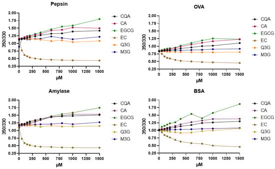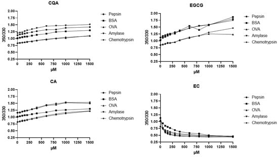 F350/F330 ratio concentration curves of four selected proteins (including ovalbumin (OVA), bovine serum albumin (BSA)) against six selected polyphenols (5-caffeoyl quinic acid (CQA), epi-gallocatechin gallate (EGCG), caftaric acid (CA), epi-catechin (EC), quercetin-3-glucoside (Q3G) and malvidin-3-glucoside (M3G)) at constant protein concentration and varied polyphenol concentration (experiments in triplicate).
