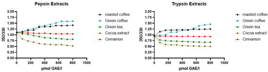 In terms of real dietary extracts, we investigated green tea, green coffee and cocoa extract. Black tea and roasted coffee displayed a strong background fluorescence, impeding measurements at higher concentrations. For all dietary materials, total anti-oxidant capacity was determined using the FRAP method and gallic acid equivalents were used as a proxy for PP concentrations in quantitative experiments. Additional LC–MS data in the negative ion mode were obtained to validate the chemical composition present in cocoa [34] (see Supplementary Materials), coffee [35] and tea [36]. These correspond in all cases to those previously reported. In all cases, changes in Trp fluorescence were observed, indicating the binding of PPs with subsequent conformational change. It can be assumed that, e.g., in green and roasted coffee with 1.3 mM of 5-CQA and 0.3 mM of 3,4 di-CQA, PPs are present and exerting an effect comparable to the authentic standard material [37,38,39]. Figure 5 shows representative examples of the nano-DSF titration curve for two representative proteins, trypsin and pepsin.