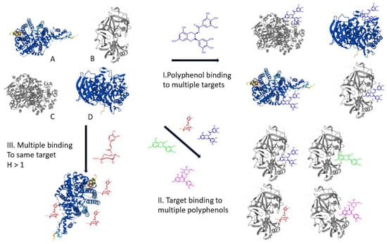 The promiscuity observed indicates a lack of selectivity of dietary PPs towards putative biological targets. A given polyphenol does not bind selectively to a single target, which is a requirement for the drug development of any pharmaceutical. It binds to several targets. Similarly, a given protein biological target shows affinity to several polyphenolic compounds. Hence, the lack of selectivity, which we refer to as promiscuity, occurs on three levels, as summarized in Figure 6. Previous studies have demonstrated that a Hill coefficient larger than one adds a third level of promiscuity with multiple polyphenol molecules binding to a single protein target.