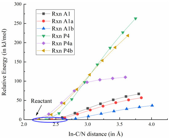 Previous work indicates that upon being injected into the reaction chamber, XMIn (X = M, D, T) undergoes pyrolysis under high-temperature excitation and with stepwise elimination of CH3. These reactions are denoted as the pyrolysis path and illustrated in Table 1 (P4–P4b) [18]. Although no TS was reported in III-nitride film growth among these reactions [18,23], in this study, the PES between the predicted reactants and products was once again investigated through constrained geometry optimizations. To probe the energy change, the distance between the In and the C in TMIn was constrained at 3.75 Å, while the rest of the proposed structure was allowed to be optimized. Similar to the scans introduced above, settings were established and repeated with a 0.2 Å decrement in the step size to gradually decrease the In-C distance from 3.55 Å to 2.15 Å to mimic the pyrolysis process. As illustrated in Figure 2, no TS could be identified along the reaction coordinates. Utilizing the same method, comparable findings were obtained for pyrolysis processes P4a and P4b.
