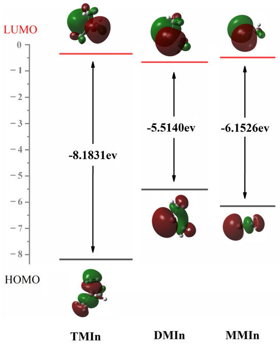 Also playing a critical role in the determination of the precursors for the subsequent surface reactions, XMIn pyrolysis serves as a significant alternative to the adduct route. As Section 2.1 concluded that the BDE trend contradicts the In-C bond length results, further NBO analysis (Table S5) was conducted on the associated three molecules to study the unique bonding in XMIn. The results indicated that the In atom of TMIn is bonded singly to three C atoms of CH3, resulting in a singlet ground state of TMIn. Similarly, the In atom in MMIn is bonded singly to a methyl group, so it also remains as a singlet with two electrons paired up. In contrast, in DMIn, the In atom only has one electron remaining after forming two In-C bonds with two methyl groups. This allows a DMIn doublet state. This pairing of spins leads to the significantly increased stability of singlet MMIn compared to DMIn. The FMOs for these three molecules were computed to further study the reactivity of the target molecules, and the HOMO–LUMO gaps are depicted in Figure 5. The largest HOMO–LUMO gap is observed in TMIn, followed by MMIn, while DMIn exhibits the smallest gap. Consequently, the HOMO–LUMO gap is positively correlated with the corresponding pyrolysis reaction difficulty.