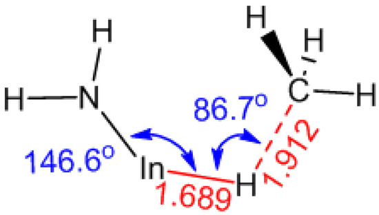 Following the formation of MMInHNH2, the subsequent elimination of CH4 through an intramolecular reaction R9 will take place after supposing a TS as depicted in Figure 6. In this process, the In-C will be cleaved first to allow the H atom to shift to a bridging position. Then, once the high-energy complex overcomes the energy barrier of 93.62 kJ/mol, the H atom will be shifted to the methyl group, leading to the generation of CH4. As illustrated in Figure S3, the Mulliken charges of the In atom, the H atom from the H radical and the C atom in the reactant, MMInHNH2, are 0.978, −0.213, −0.839, respectively. In contrast, in the characterized TS, these values shift to 0.693, 0.060, and −0.816, respectively, suggesting that predominant charge transfer occurs from H to In.
